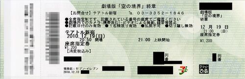 先週の土曜日から、チケット販売されていた劇場版「空の境界」終章。 開始時間からスタートダッシュでアクセスしたのですが、アクセス過多でしばらく開かず。 開いた時には、既に初日は完売でした。orz んで、予約したのは19日です。 既に「空の境界 Blu-ray…
